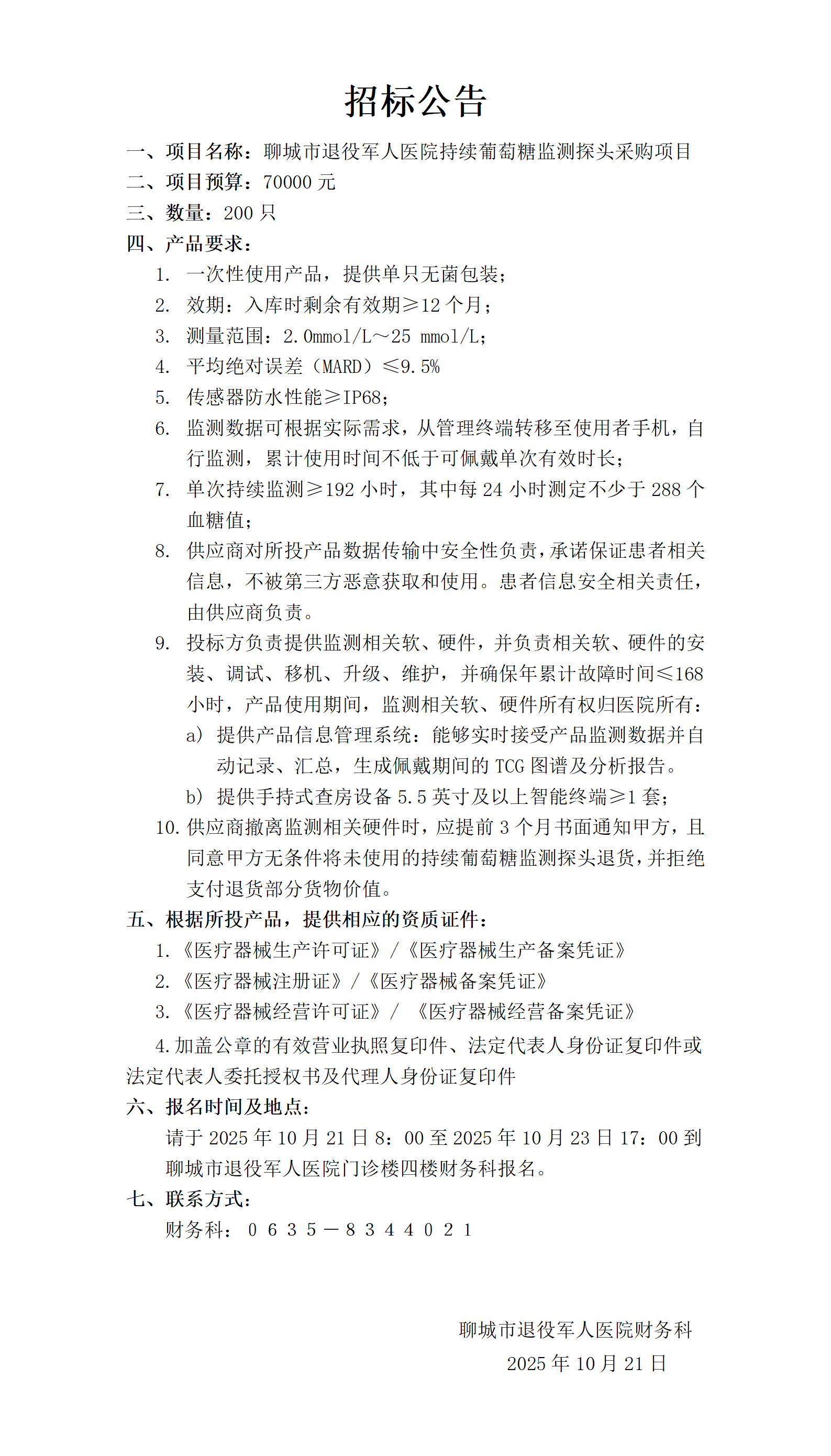 聊城市退役军人医院持续葡萄糖检测探头采购项目招标公告